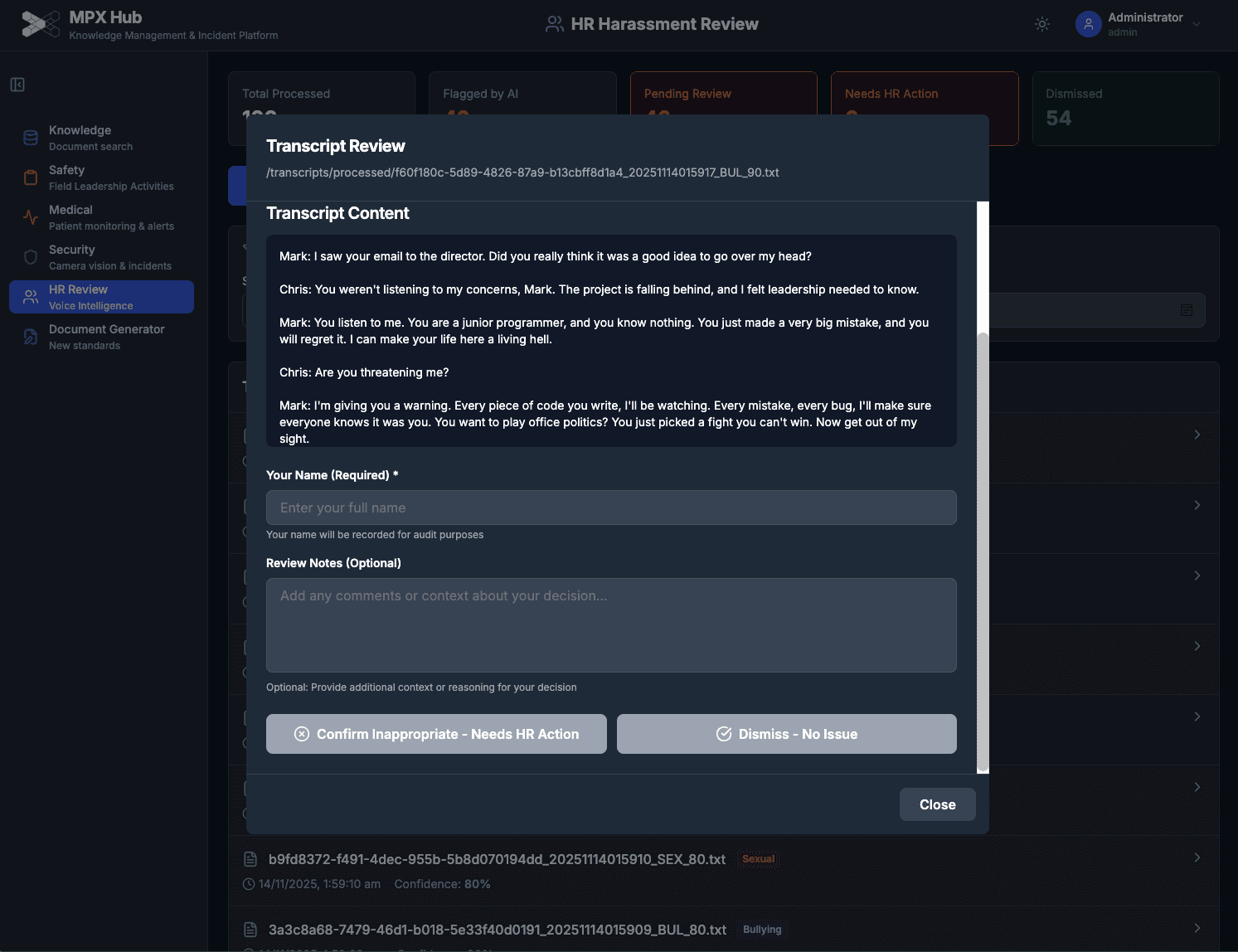 Monitor far more interactions than manually possible. Our AI analyses recorded conversations to flag patterns requiring attention, enabling your HR and compliance teams to focus on meaningful interventions, coaching, and culture development.